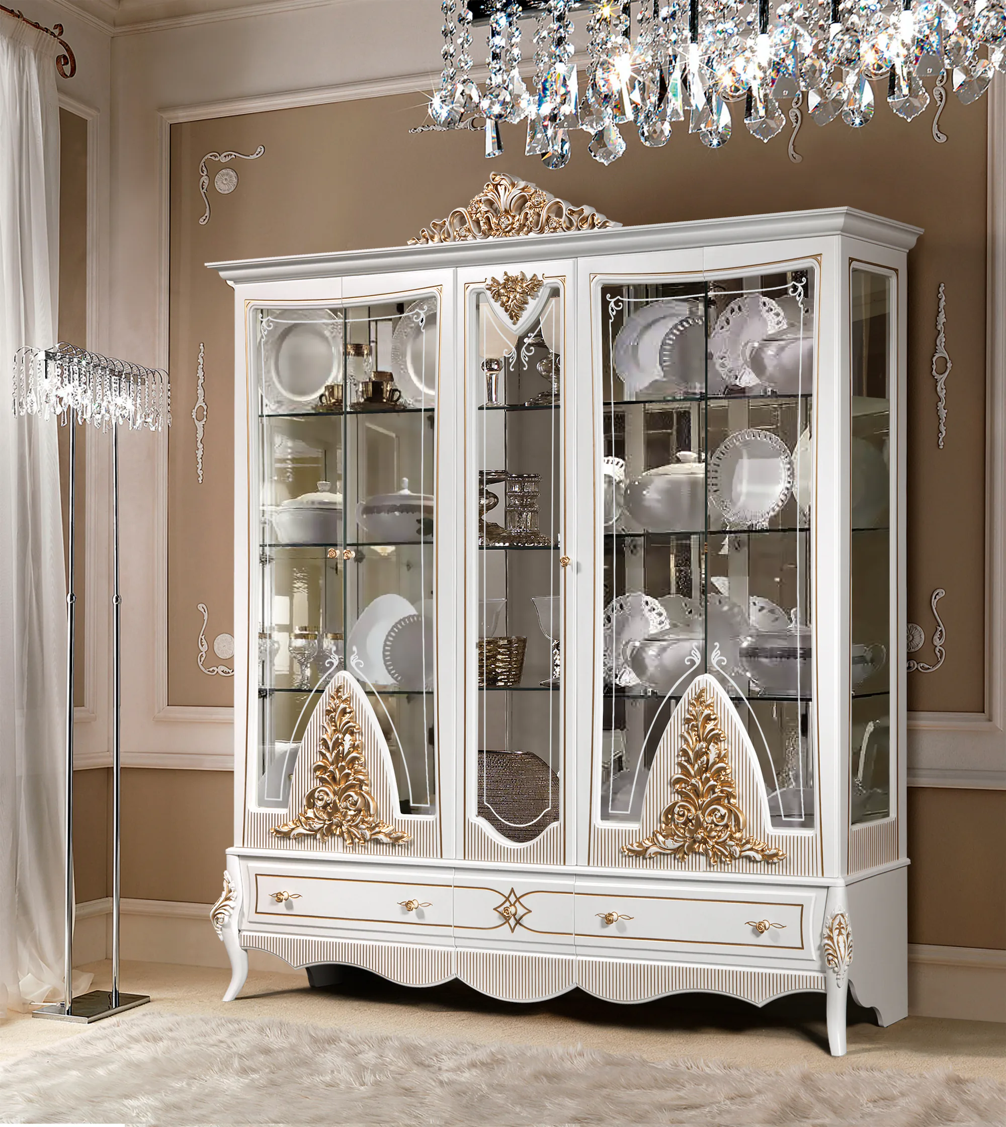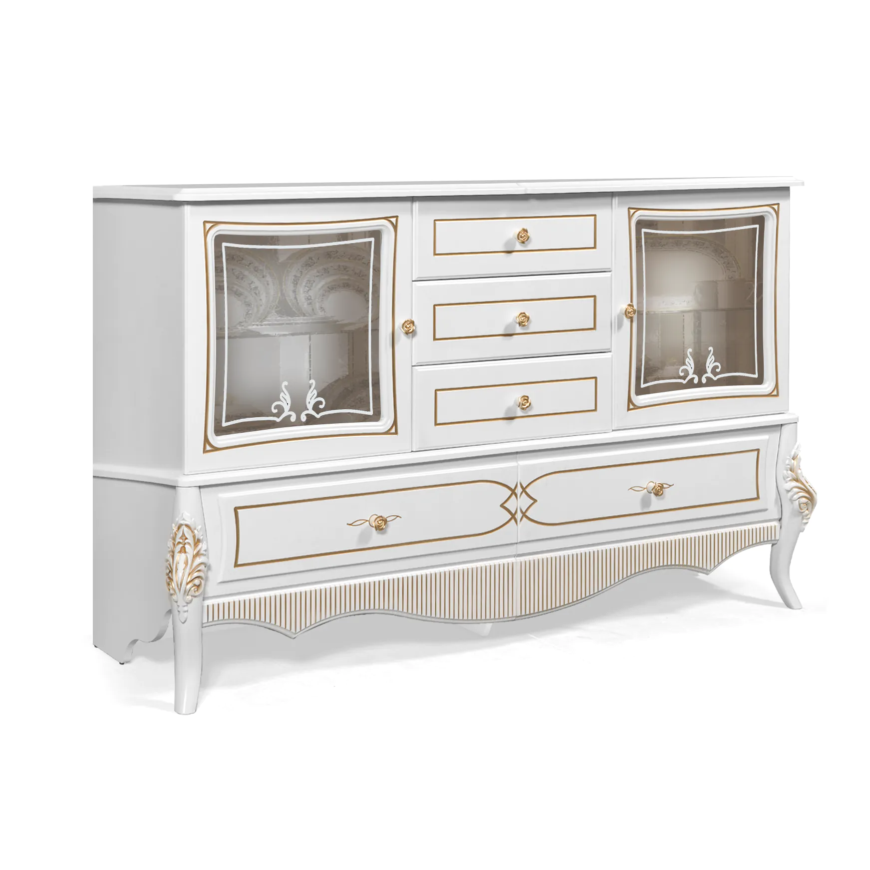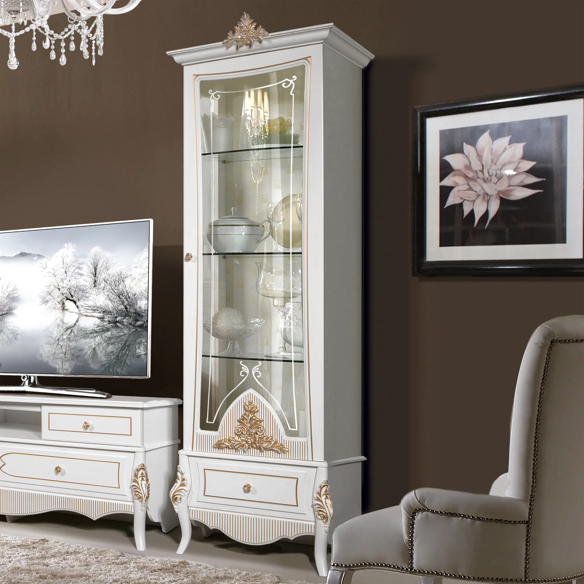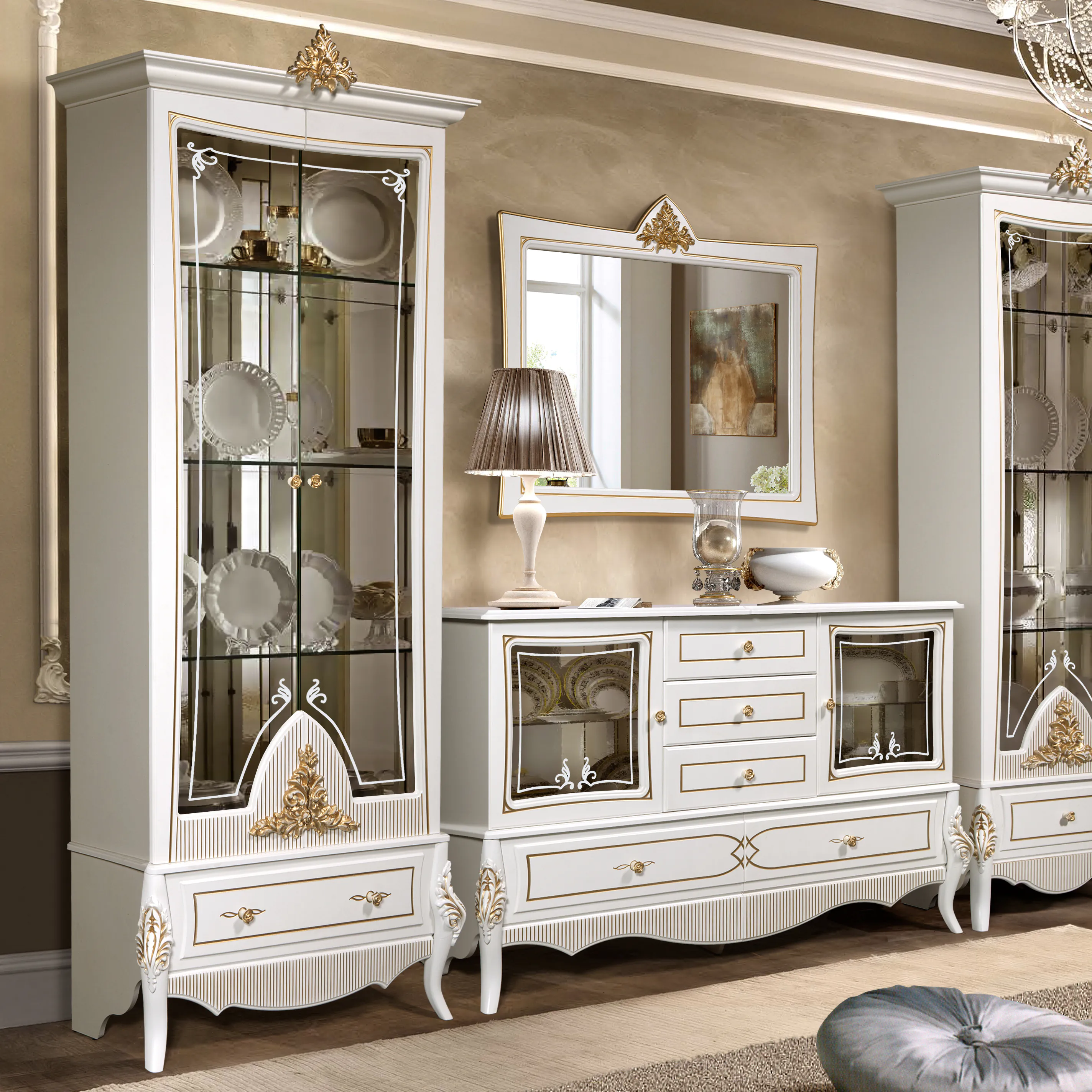 Шкаф с витриной 5 дв. В2430 х Ш2357 х Г482Шкаф с витриной 2 дв.В2334 х Ш1018 х Г456Шкаф с витриной 1 дв.В2335 х Ш756 х Г456 Комод В1010 х Ш1692 х Г483Зеркало В1219 х Ш970 х Г54Тумба для ТВ В663 х Ш1692 х Г483
