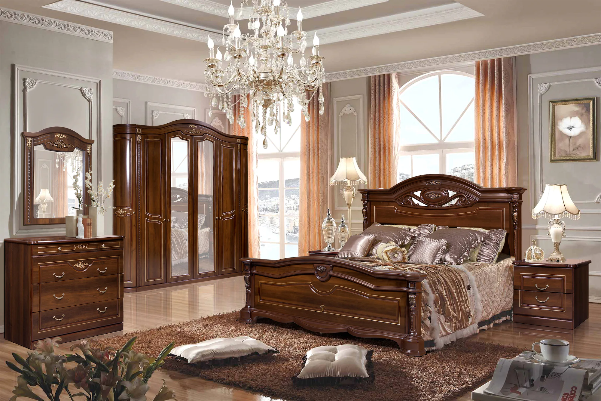 Шкаф 6 дв. В2341 x Ш2384 x Г598 Шкаф 4 дв. В2341 x Ш1798 x Г598 Кровать В1205 x Ш2020 x Г2168 (матрас 1800 х 2000) Зеркало навесное В900 x Ш833 x Г44Комод В856 x Ш1084 x Г473 Тумба прикроватная В472 x Ш534 x Г436
